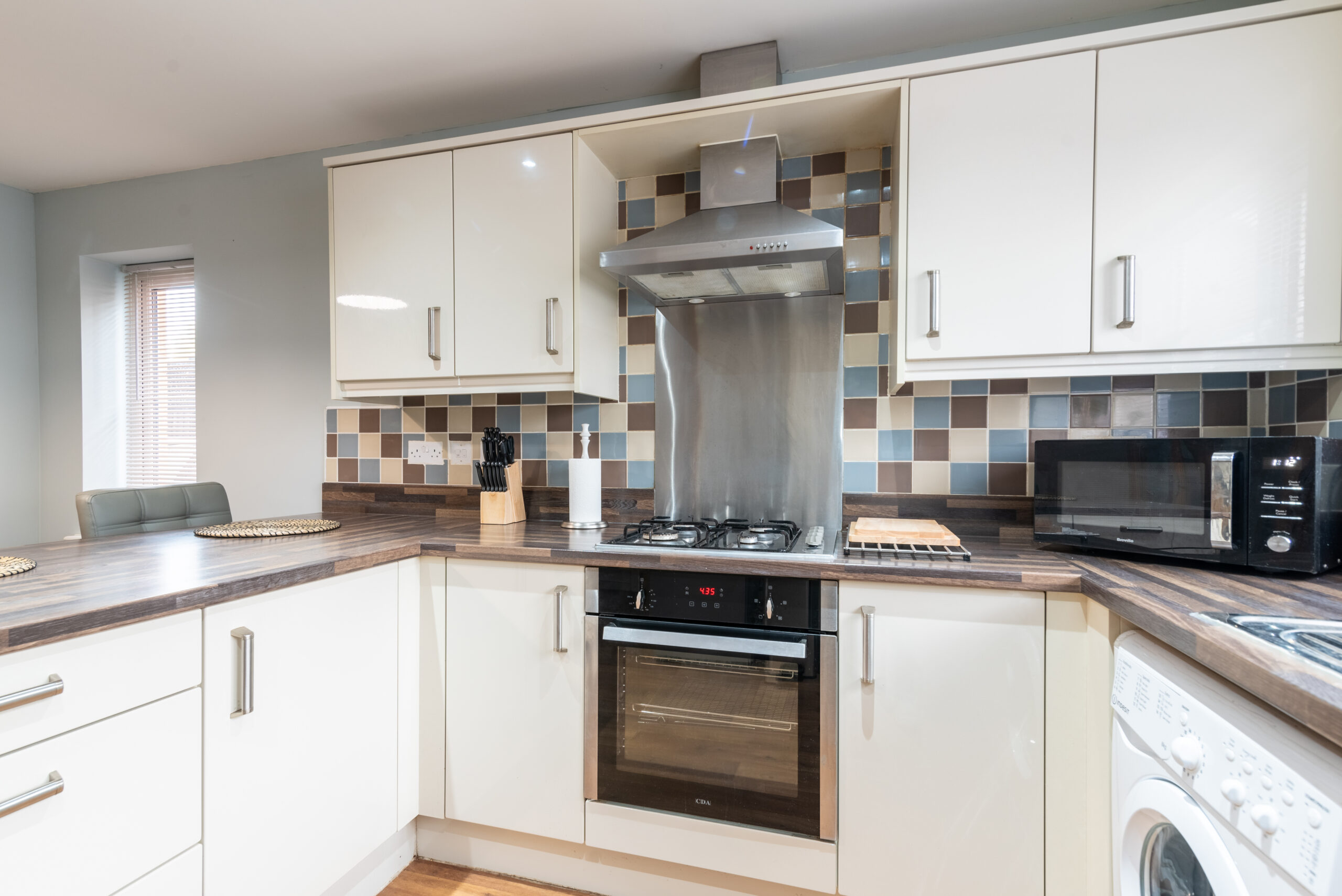 The open-plan kitchen and dining area is ideal for both everyday living and team stays. With generous worktop space, integrated appliances, breakfast bar seating and a separate dining table, the layout makes cooking and dining effortless. Patio doors open directly onto the enclosed garden, offering additional space for fresh air or informal outdoor seating.