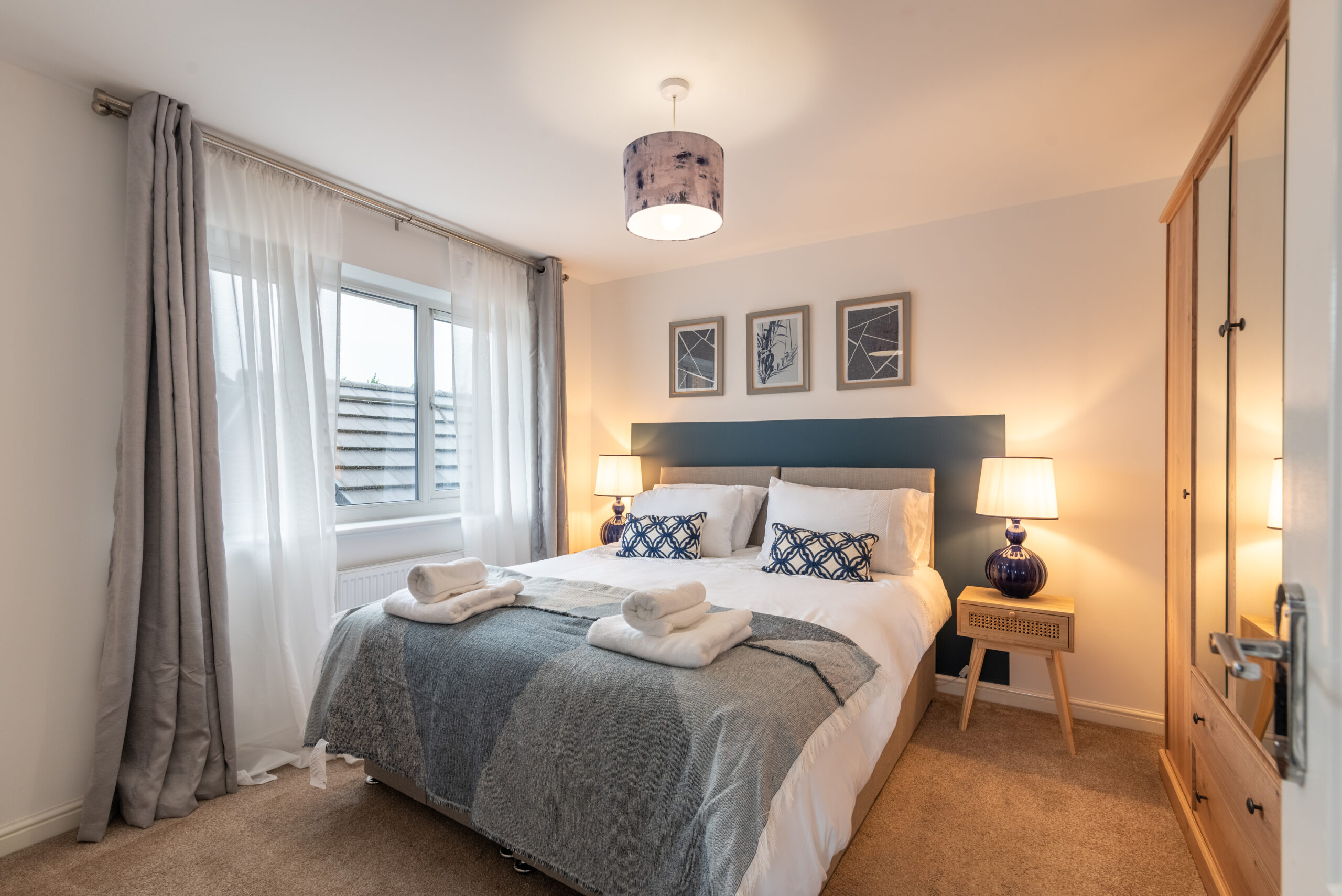 Upstairs, the bedrooms are light and comfortably furnished with quality bedding and ample storage. The property benefits from both a modern family bathroom with bath and overhead shower, plus an additional shower room — providing convenience for multi-guest stays.